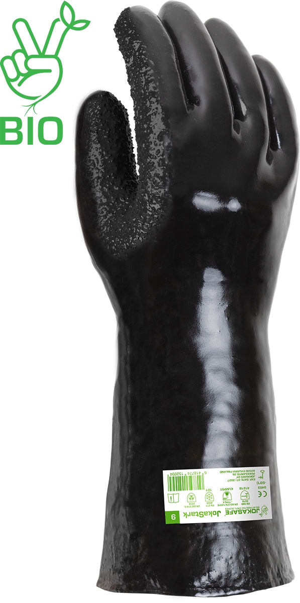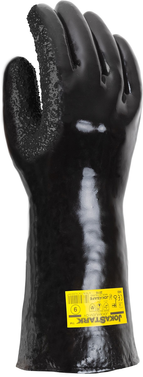 Notkea Jokasafe JokaStark pitkävartinen kohdevahvistettu vinyylisuojakäsine ohuella puuvillavuorella. Sormikkaan kämmenessä ja sormenpäissä on rouhepintainen vahvistus, joka takaa pitävän otteen ja kestävyyden esim. puunjalostustöissä.